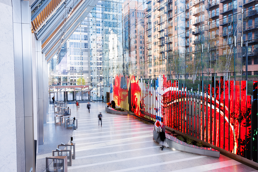 The process of creating the piece was multilayered and iterative. Wasmer and Adamson filmed each other working on various physical art pieces, highlighting the motion and process of each piece. Adamson says the project retained some original concepts from early in the process, such as painting on glass, ceramic work, and digital animations, but other aspects evolved as the pair worked creatively together for a year. The installation consists of a uniquely designed digital display utilizing 89 separated LED blade panels. Adamson describes it as a compelling mix of painting and digital space come to life. “The space itself and the display are important to see the piece. It reflects around the room,” Adamson said.