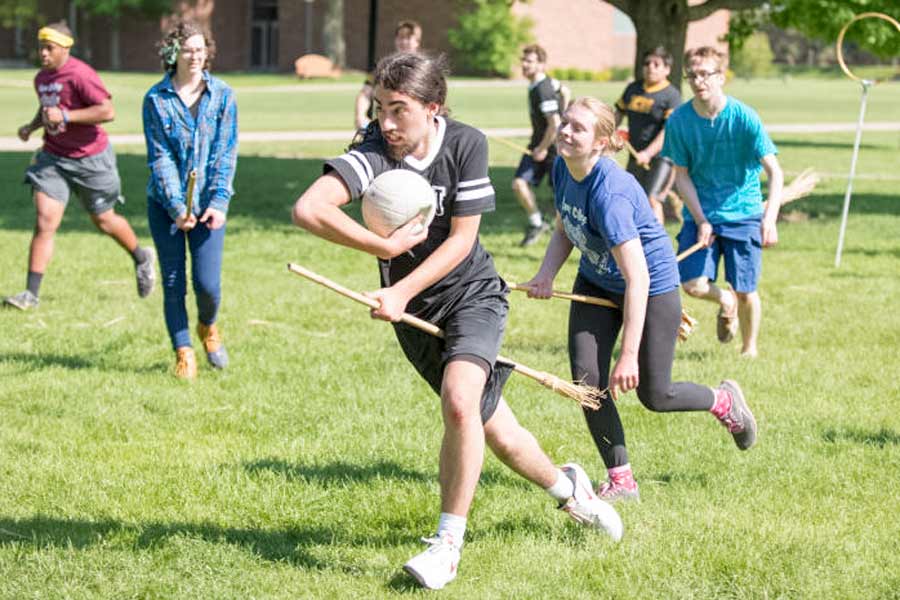 (Photo at top of page: Knox Chemistry Club's potion-making table. Photos below: Learning about herbology; decorated magic wands; playing Quidditch.)