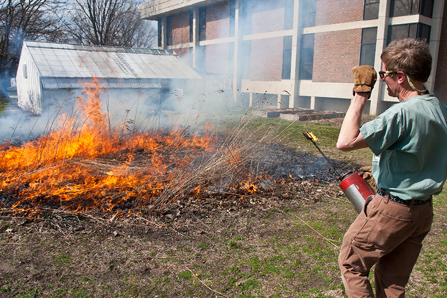 Professor Stuart Allison was able to burn a small restored prairie on the Knox campus, but larger burns couldn't be held due to unusually warm spring weather.