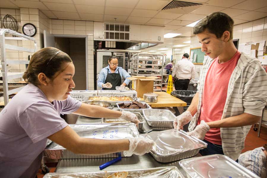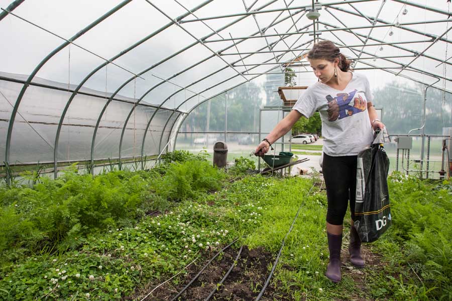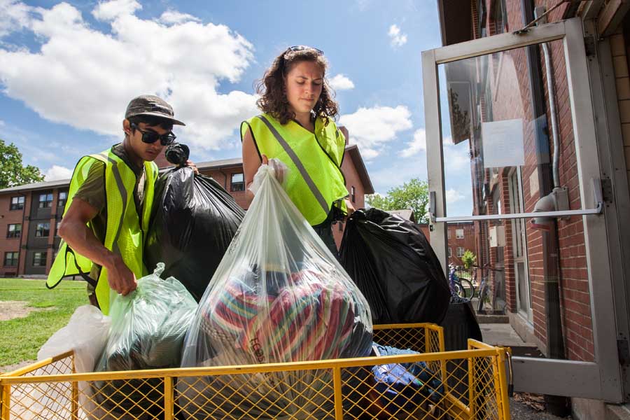 Photos below: students collect unneeded items from residence halls for recycling and reuse; grow their own food in an on-campus "high tunnel"; handle dining hall surplus for donation to local non-profit agencies.
