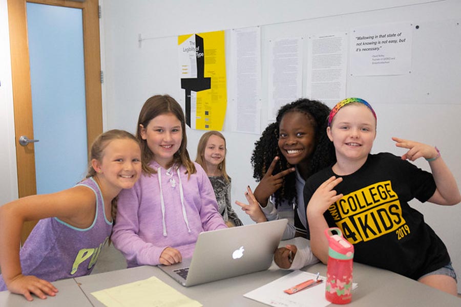 (Photo at top of page: Some of the 2019 College for Kids Fellows—from left, Sarah Wallenfelsz, Jenny Lau, Katie O'Brien, and Alex Gallo. Photos below: Scenes from College for Kids classes.)