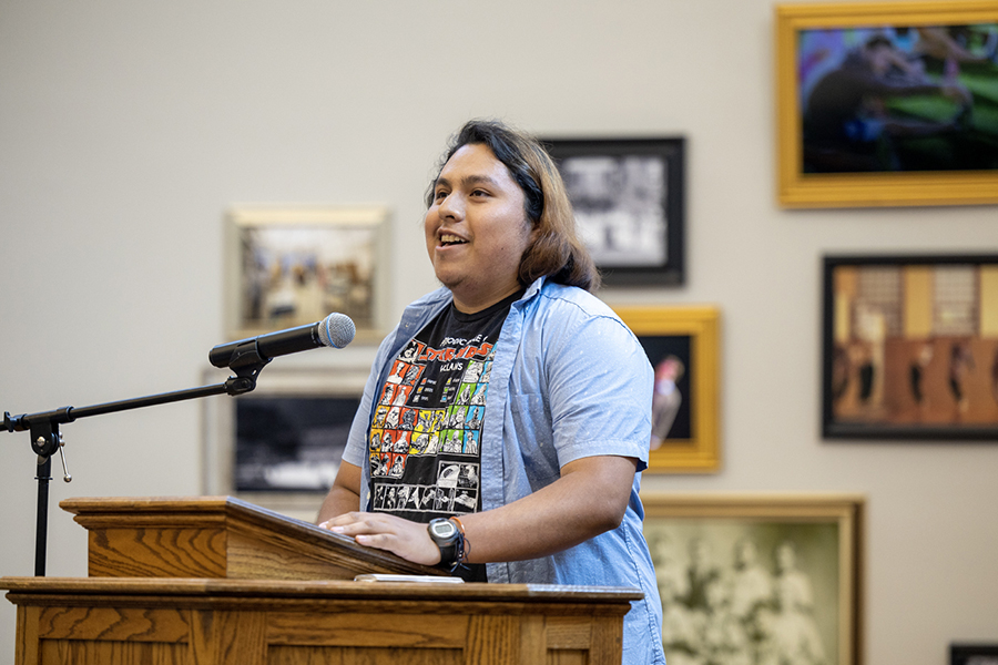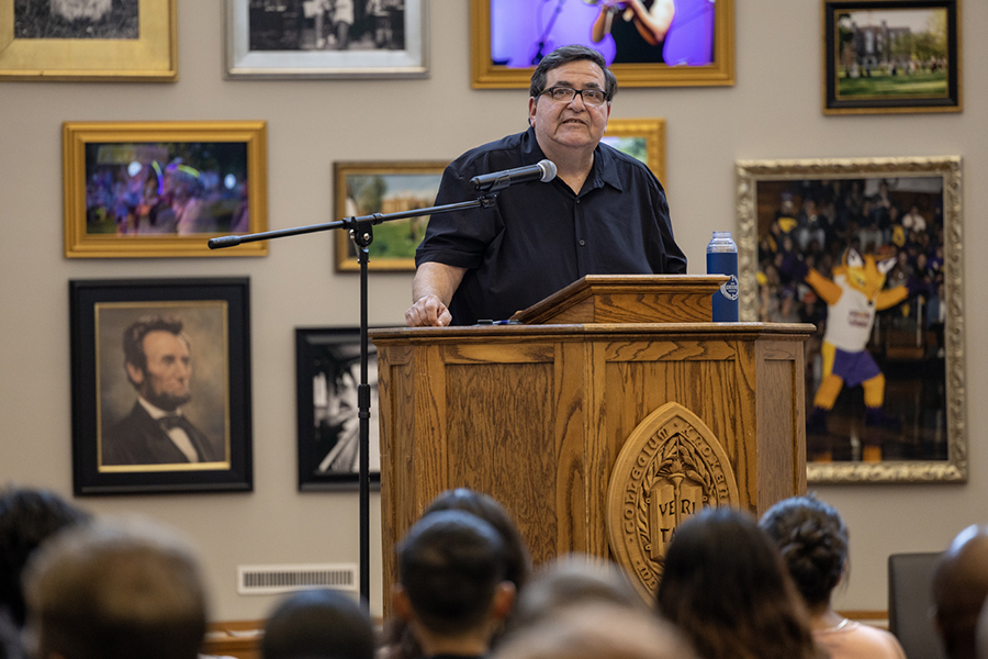 Before hearing from student speaker Juan Ramirez '23, Provost and Dean of the College Michael Schneider introduced TRIO Writing Coordinator Paul Marasa. Marasa retires from Knox this year after 30 years of dedicated service. Marasa shared that he, too, is a first-generation college student and is familiar with the unique challenges and obstacles that come with that title. He recalled his family’s sacrifices to help him make it to graduation. “The places we came from don’t always look like the places we are trying to go,” he said.