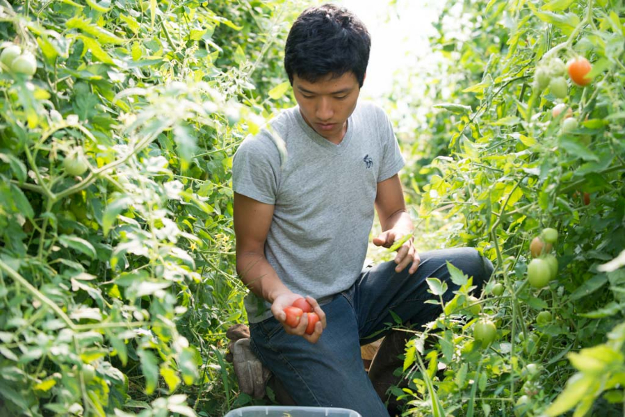 Above, student Isaac Lee harvests produce in a college-operated "high tunnel."