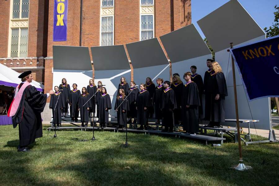 The Knox College Choir, under the direction of Assistant Professor of Music and Director of Choral Activities Bram Wayman, led the audience in the signing Hail to Alma Mater to conclude the ceremony.