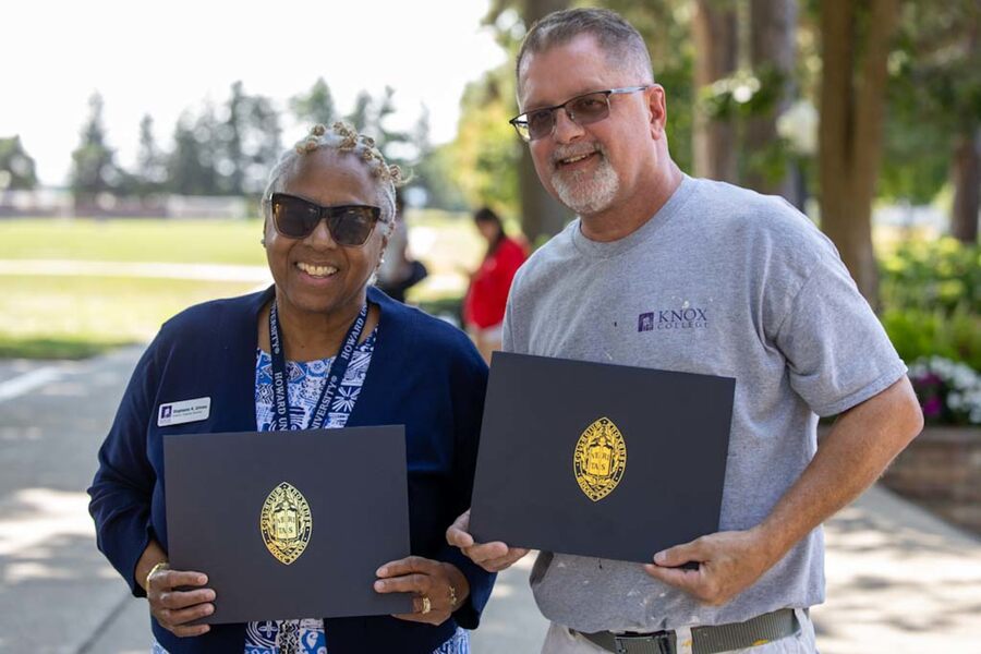 Two members of the staff were awarded this year’s Janet C. Hunter Awards by President McGadney, recognizing their outstanding accomplishments and service to the College. This year’s recipients were Bob Barry, painter in Knox’s facilities department, and Director of Disability Support Services Stephanie Grimes.