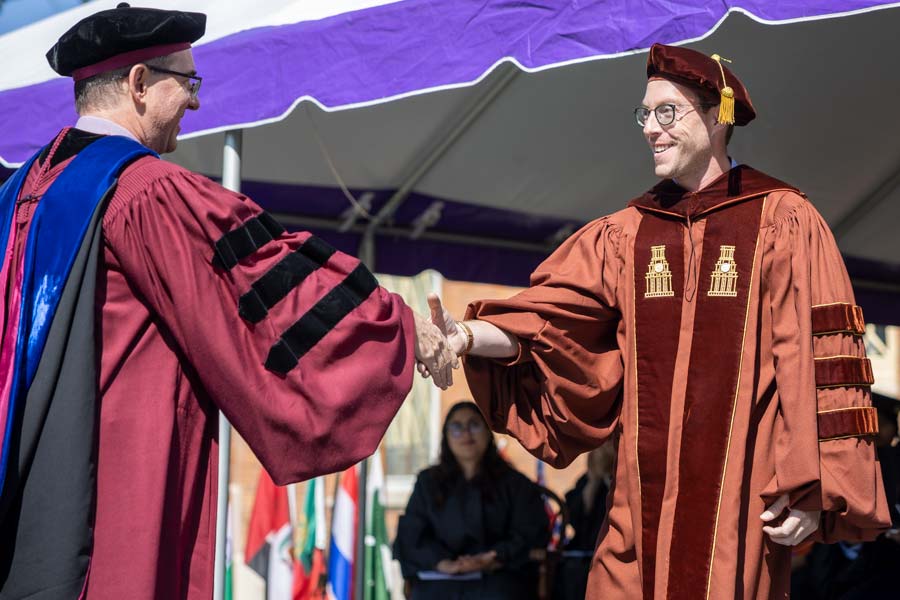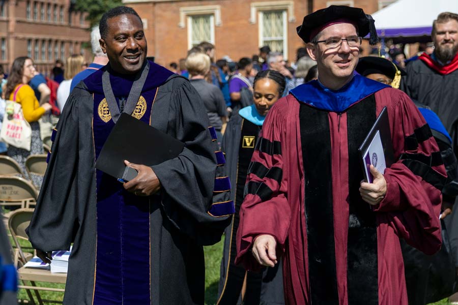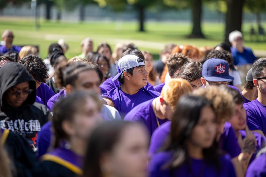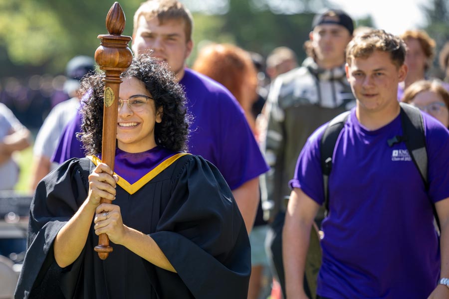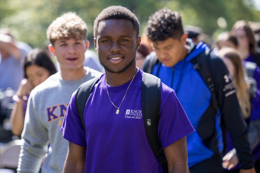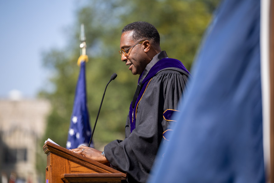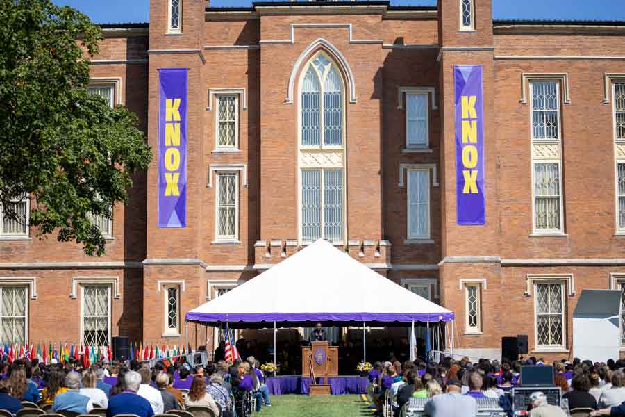 Knox College President C. Andrew McGadney followed with his Convocation address, praising the perfect weather and notes of Knox purple and gold mixed into the crowd’s apparel. He noted that he was excited to work together with the Knox community to make this the College’s best year yet.