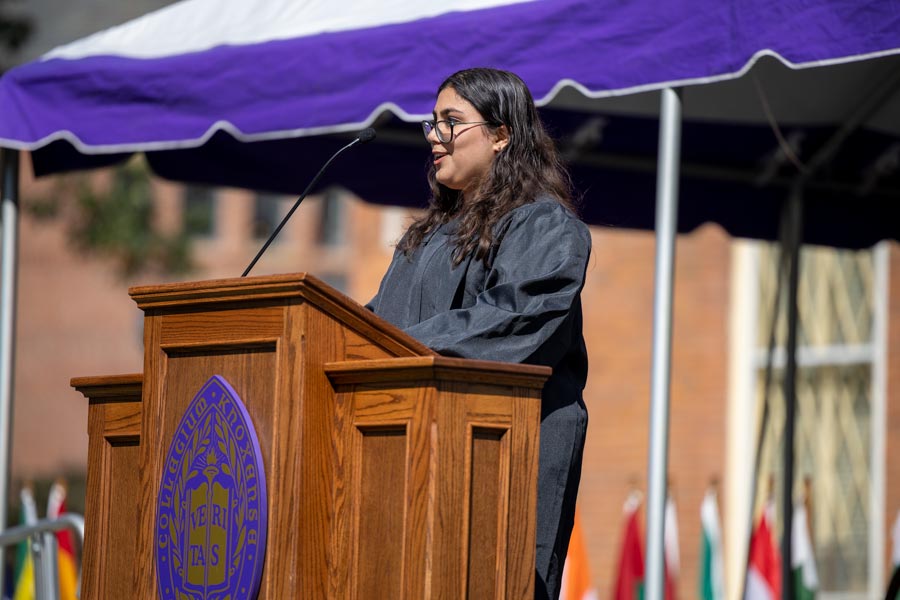 The annual event opened with a greeting from Nysa Phulwar ‘26. Phulwar reflected on her first year as a Knox student, sharing several key moments from her journey. She recalled the shocking change in climate in contrast to her home country of India, the experiences of joining many extracurricular clubs, and the freedom she felt to explore her own path at the College. She urged the students of the incoming class of 2027 to reach out and try new things while embracing the challenges ahead.