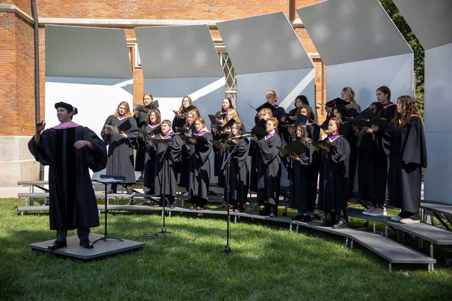 Assistant Professor of Music Bram Wayman closed the ceremony by leading the Knox College Choir in a performance of the Knox Hymn while the crowd sang along, signifying the start of the 2023-24 academic year.