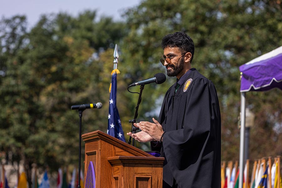 Photo at the top of the page: The audience gathers on the South Lawn of Old Main to watch Opening Convocation 2021. Photos above: Associate Dean Tim Foster presents the Faculty Scholarship Prize to Sophia Bowley '22; Student Senate President Mujtaba Hassan '22 delivers remarks; adjunct music instructor Semenya McCord sings Just Hold On; Music Professor Laura Lane leads the Knox College Choir in a performance of Bogoroditse Devo.