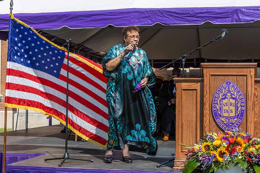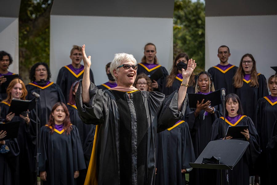 Opening Convocation also included brief remarks from Student Senate President Mujtaba Hassan ‘22, Associate Dean for Faculty Affairs Danielle Steen Fatkin, and College President C. Andrew McGadney, as well as powerful musical performances by the Knox College Choir, directed by Professor of Music Laura Lane, and Semenya McCord ‘71, adjunct instructor in music.