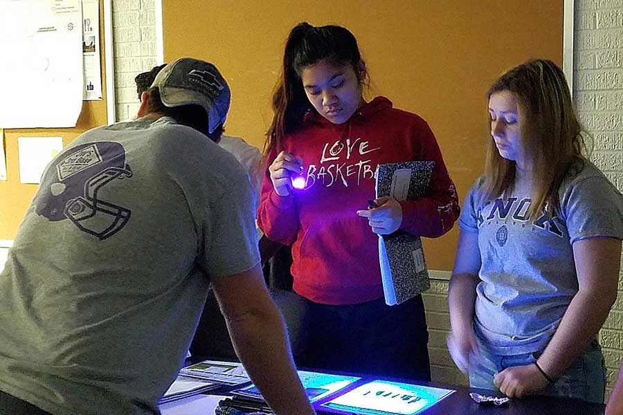 (Photos by Matt Koester/The (Galesburg) Register-Mail. Photo at top: Eric Dickens teaches students in his Adolescent Development class. Photo below: Students in the class use a black light to uncover clues to a puzzle. )