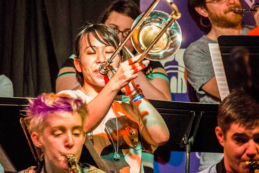 Yumi Kusunoki '10 played at Rootabaga as a student and journeyed back to Galesburg from Osaka, Japan, to play her trombone with the Knox Alumni Big Band.