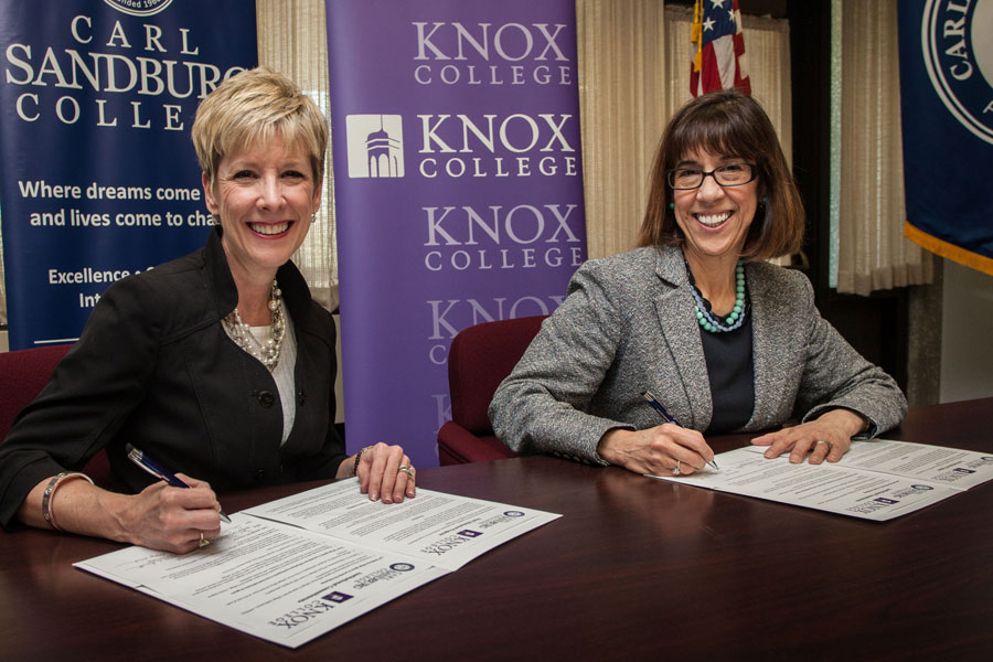 The agreement was signed by Sandburg President Lori Sundberg and Knox President Teresa Amott at a news conference Monday, May 5, 2014 at Sandburg. It will go into effect with students applying for enrollment at Knox in the fall of 2015.