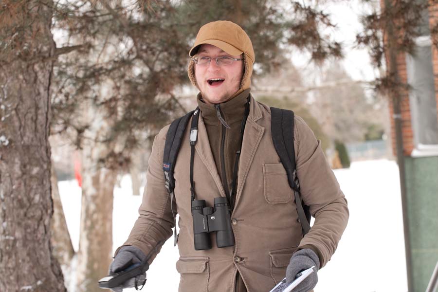 In addition to focusing on where the Knox squirrels live and store their food, Galdek also studies how they interact with the large flocks of crows on campus that also roost in the trees during winter.