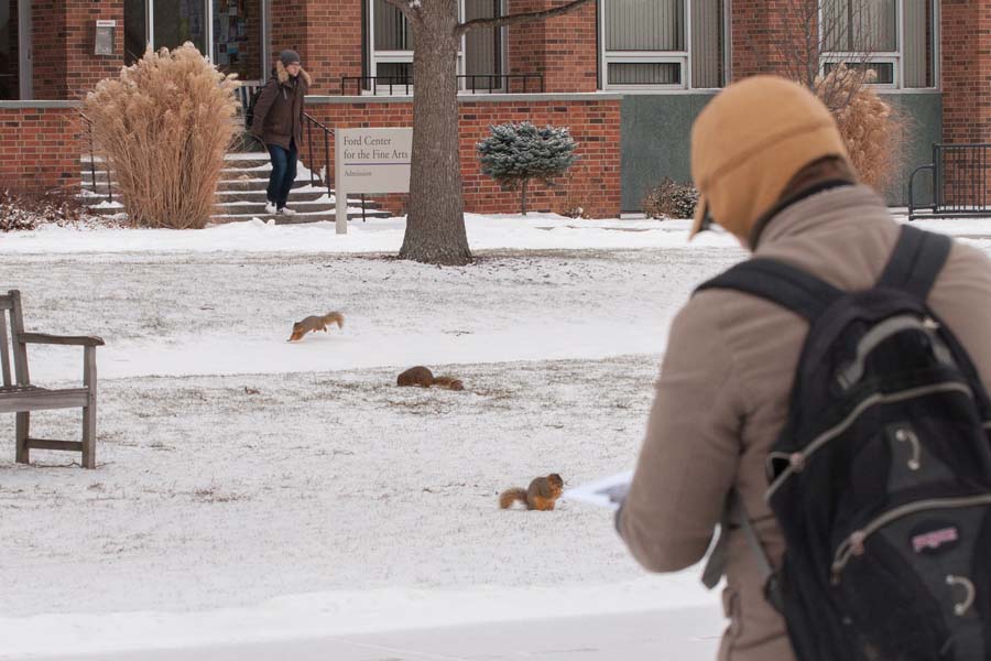 Fox squirrels do not hibernate. Galdek has estimated that 45 to 60 fox squirrels call Knox's campus home and spend the winter living in tree nests.