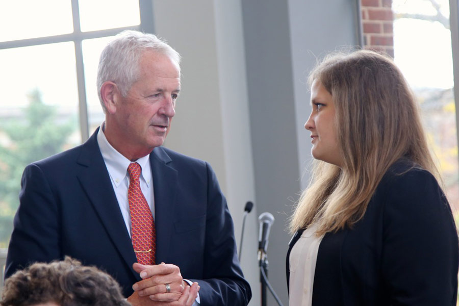 (Photo at top of page: Emily Trevor, Alex Contreras, Professor John Spittell, Monika Kopec, and Jinglin Feng at the Simon Business School's 2016 Early Leaders Case Competition. Additional photo: Professor John Spittell chats at the case competition with Knox alumna Laura Lueninghoener '16, who is pursuing a master's in marketing analytics at Simon Business School.)