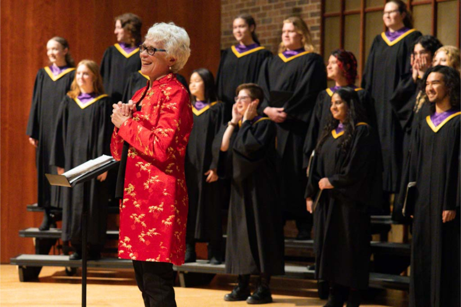 The impact of Lane’s tenure was amplified during her final Knox concert on March 24, 2023. Every seat in Kresge Recital Hall was filled as the choir returned from their France tour to showcase their work to the Knox community. After a night full of music, Lane welcomed choir alumni up onto the stage to sing the Knox Hymn with her one final time. Dozens of singers crowded the stage, creating a booming tone as the hymn was sung.