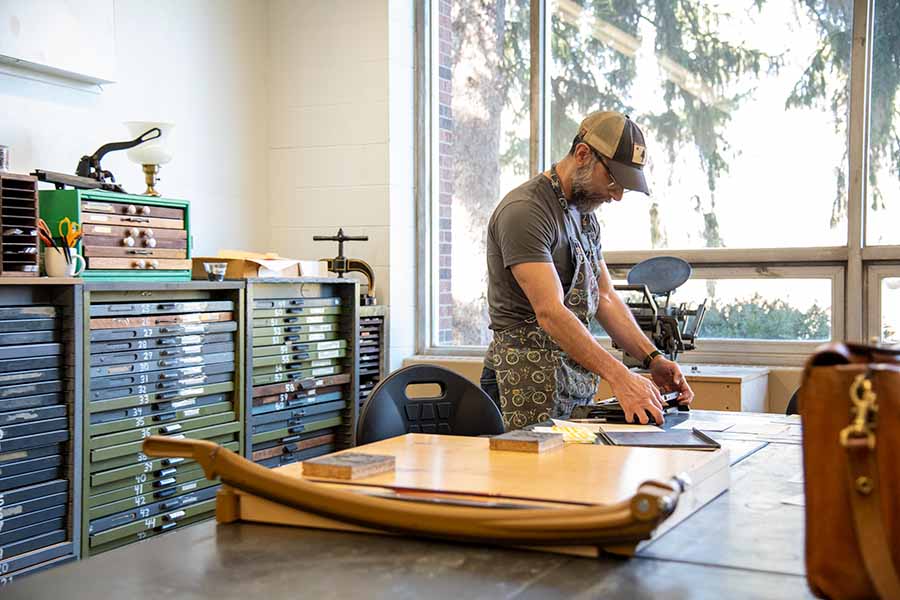 In late 2023, Knox College worked to move its state-of-the-art letterpress onto campus and into a new studio retrofitted into what was previously the ceramics studio of the Ford Center for the Fine Arts (CFA).
