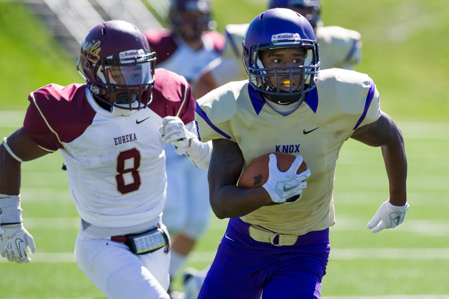 The Knox College Prairie Fire football team won a 26-23 thriller against Eureka College in the third annual Lincoln Bowl game Saturday, September 6, 2014 on Stisser Field at the Knosher Bowl in Galesburg.