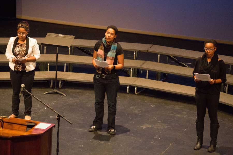 The convocation ceremony also featured three students who recited poems inspired by their experiences as people of color. The students and their poems were Jordan Hurst '17, "Chloe"; Nicole Hunter '16, "The Advice I've Gotten"; and Catlin Watts '16, "History Repeating." In addition, the Knox College Choir performed.