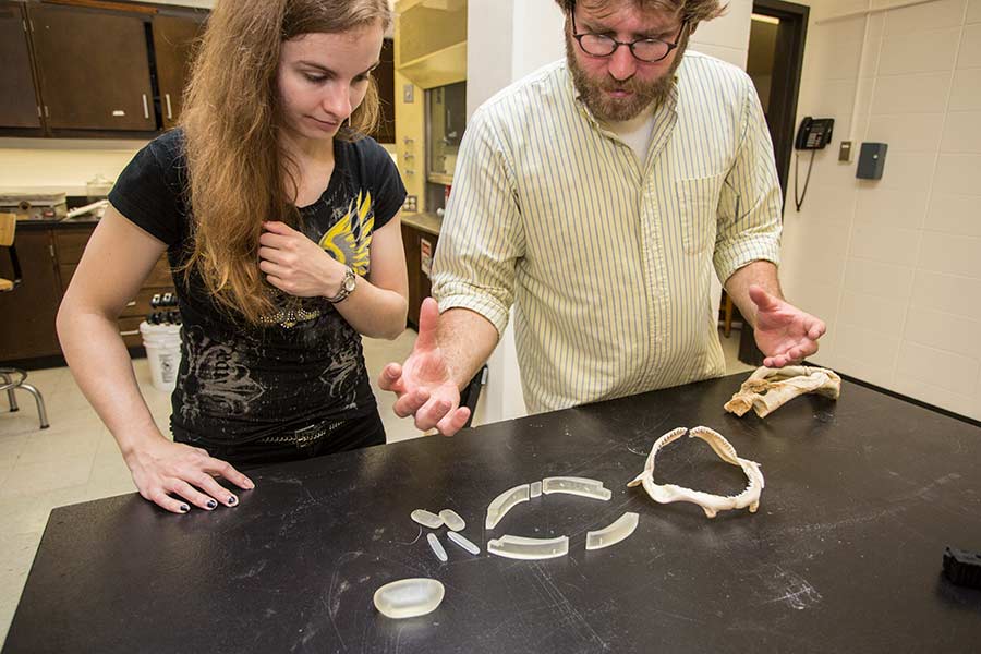 Pictured above, a student examines ancient pottery found in Dhiban, Jordan. Below, Professor Nick Gidmark shows a student plastic, printed models of a fish jaw.