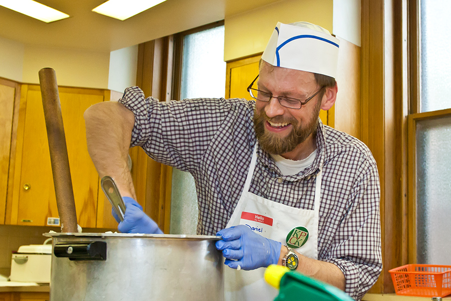 (Photo at right: Knox Prairie Community Kitchen volunteer Daniel Beers, a political science professor at Knox College, assists in the kitchen during one of KPCK's community dinners.)