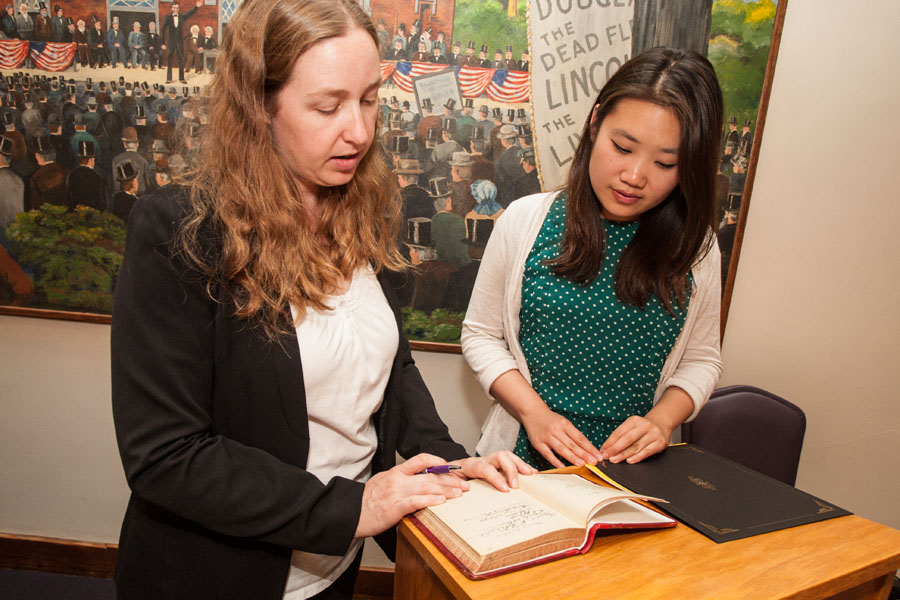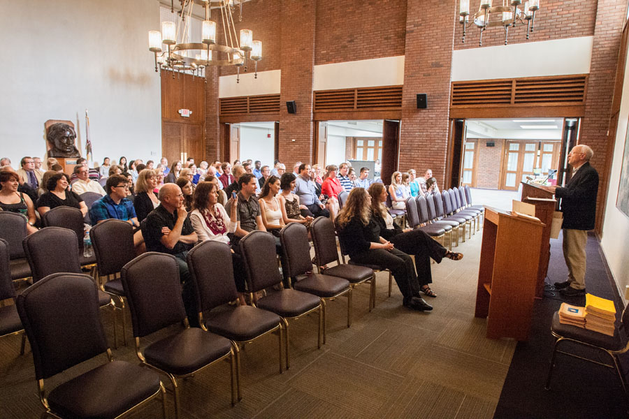 Above, professor Katherine Adelsberger, president of the Knox College chapter of Phi Beta Kappa, shows the century-old membership register to inductee Yun Lin '16; inductee Oluwagbemiga Abiodun Ojo '16 signs the register; inductee Noah Gleason-Hart looks through prior years in the register. Top of page, professor George Steckley describes the history of Phi Beta Kappa.