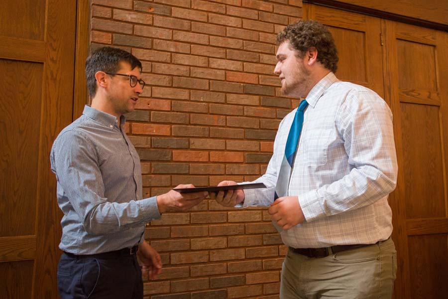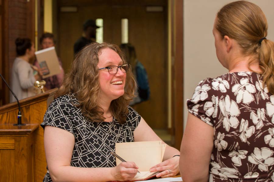 Above, Knox College history professor Michael Schneider narrates the history of Phi Beta Kappa; below, new members are welcomed by faculty officers of the Knox College chapter: Helen Hoyt, associate professor of chemistry, Katherine Adelsberger, Douglas and Maria Bayer Endowed Chair in Earth Science; and Andrew Hertel, assistant professor of psychology. More photos from the annual induction ceremony on Flickr...