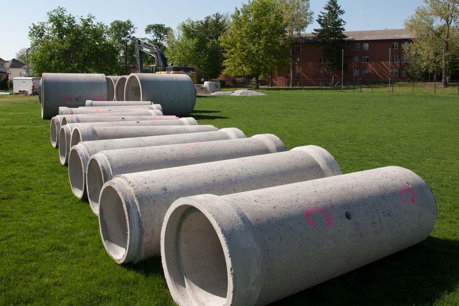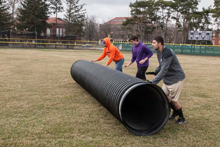 Above, students in a history course use plastic "straws" to re-enact ancient Greek warfare. Below, three areas on campus where paper straws will not be used: underground drainage, holding the tarp for the baseball field, and in the science lab...