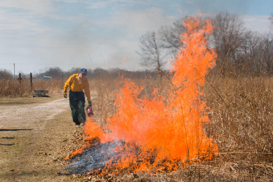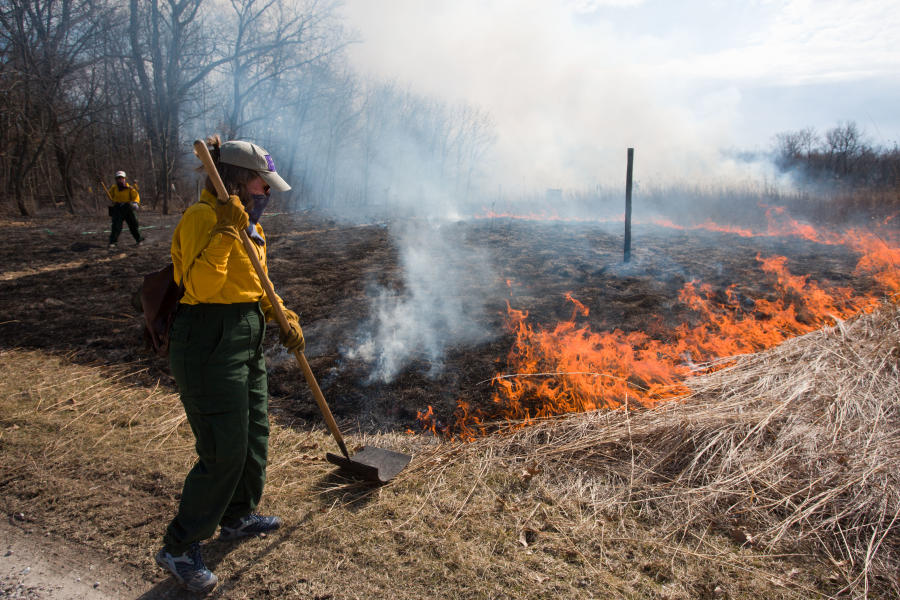 But it was perfect weather for the burn on March 22—56.7 degrees F and sunny with 36.4% relative humidity and wind at 1.2 mph—when biology professor Stuart Allison, a dozen students and two of Allison's faculty colleagues set a series of controlled fires. Knox has been conducting burns since the 1950s to restore several prairies at Green Oaks.