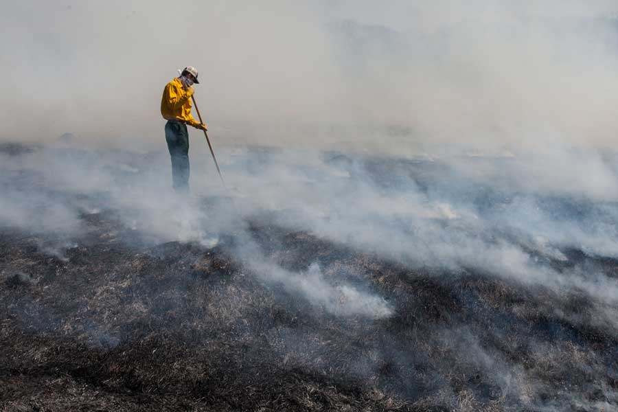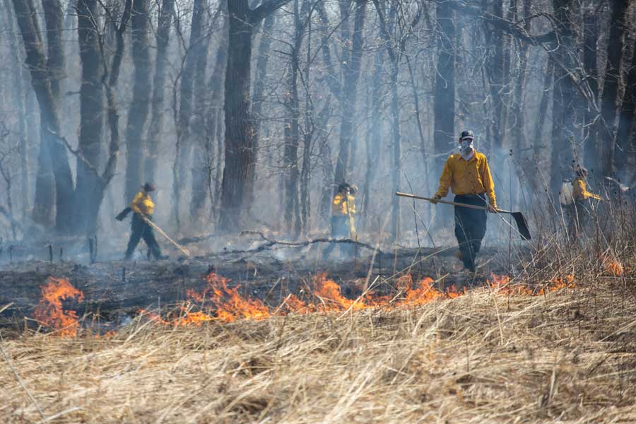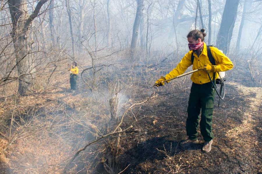 Allison, a professor of biology and director of Green Oaks, worked with the students earlier to educate them about safe burning practices. On Saturday, April 4, they were issued fire-resistant clothes, gloves, and other gear -- including a long-handled tool called a "flapper," which is used to tamp down flames and burning embers.