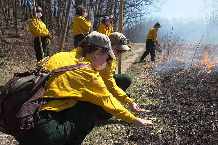 Knox College's annual prairie burn brought together students and faculty as they set a controlled fire to the prairie land at Green Oaks Biological Field Station. The 12 Students, along with Associate Professor of Art Tony Gant, assisted Professor of Biology Stuart Allison in setting the fires.