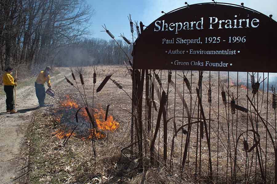Shepard Prairie is named in honor of Paul Shepard, a biology professor at Knox who was instrumental in the inauguration of prairie restoration at Green Oaks in the 1950s. The area was familiar territory to Rafael Cho, a senior on the burn crew who studies environmental studies and biology.