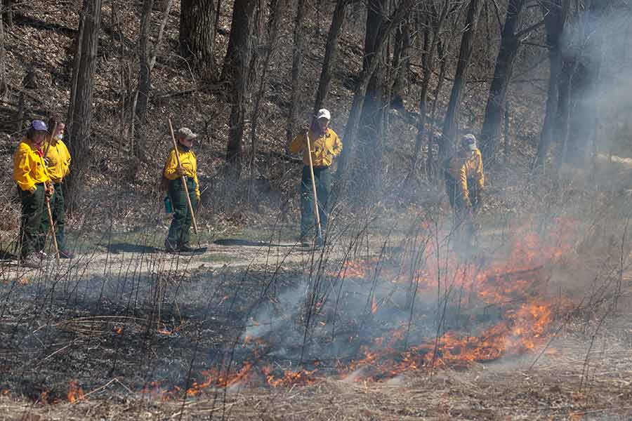 The annual burns aim to protect prairie grasses from intrusions of woodland scrub and competition with exotic species that have been introduced to Illinois from other regions or countries.