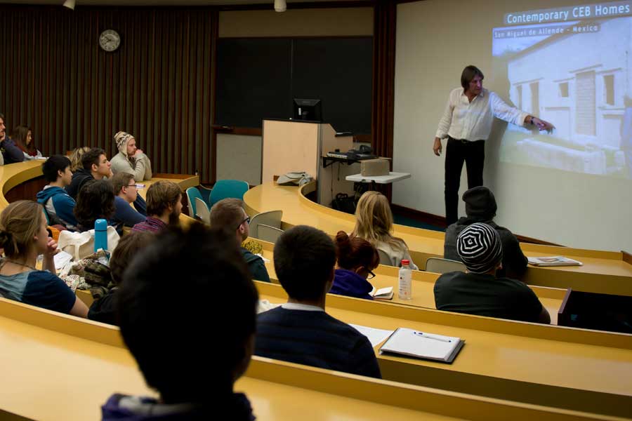 Knox College's Second Annual Prairie Fire Bioneers conference featured a keynote address by 2010 Alumni Achievement Award Winner James Hallock '69, founder of Earth Block Inc. Earning him the nickname "Dr. Dirt," Hallock constructs cost effective homes from compressed earthen blocks with a machine that allows him to take his efforts practically anywhere in the world.