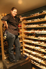 Jess Drew'07 keeps both feet firmly planted at the wall of shoes in the costume department.