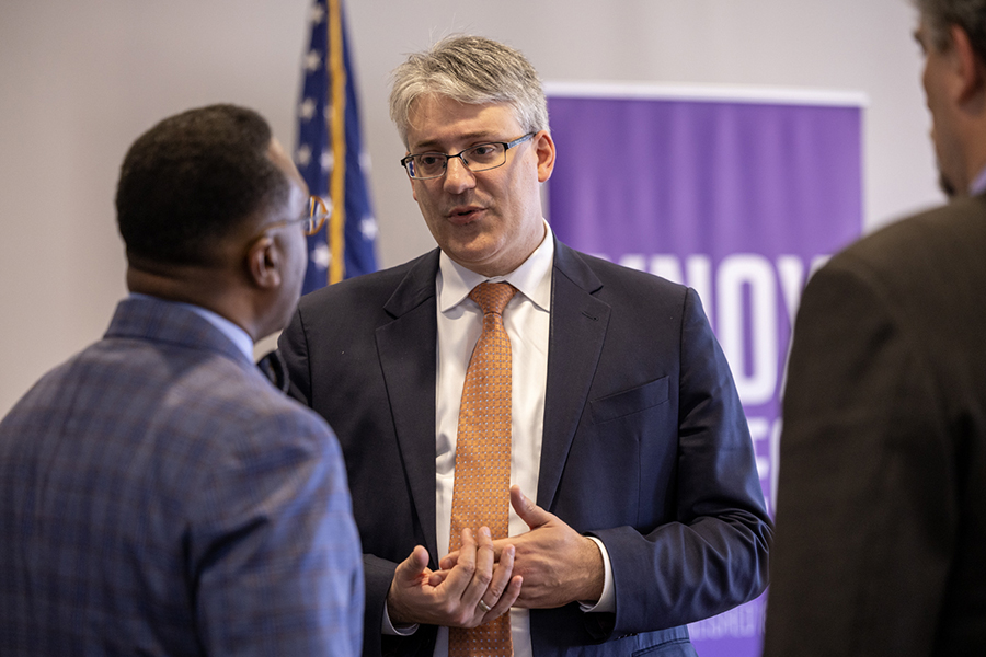 Knox College President C. Andrew McGadney opened the conversation by speaking alongside Carl Sandburg College President Seamus Reilly. They discussed the local connection and education pipeline formed between the two colleges. The pair expressed a strong desire to attract Pell Grant-eligible students and help them succeed in post-secondary education.