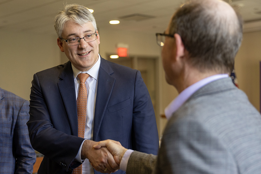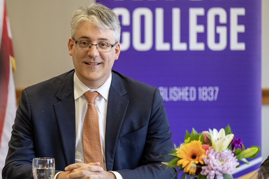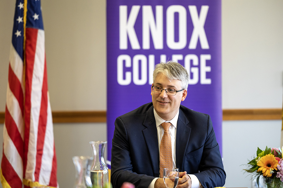Illinois Senator Mike Halpin visited Knox College on Thursday, April 13, to speak with Knox senior staff members and local community leaders on his final stop of a two-week listening tour of colleges and universities in the 36th Senate District.