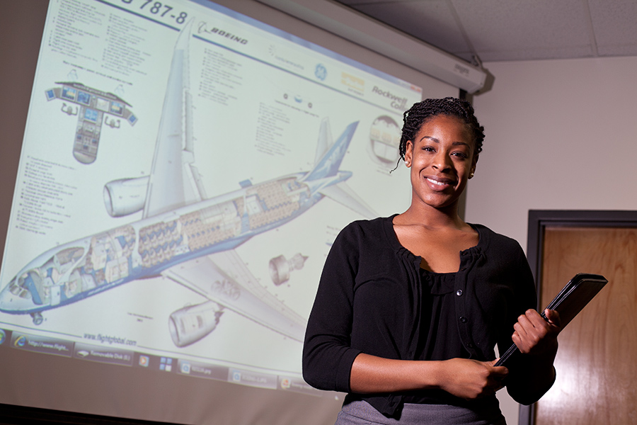 Tiesa McElroy is responsible for core estimating at her internship in Boeing's finance department in Everett, Washington. Tiesa is a senior economics major and business and management minor from Seattle, Washington.