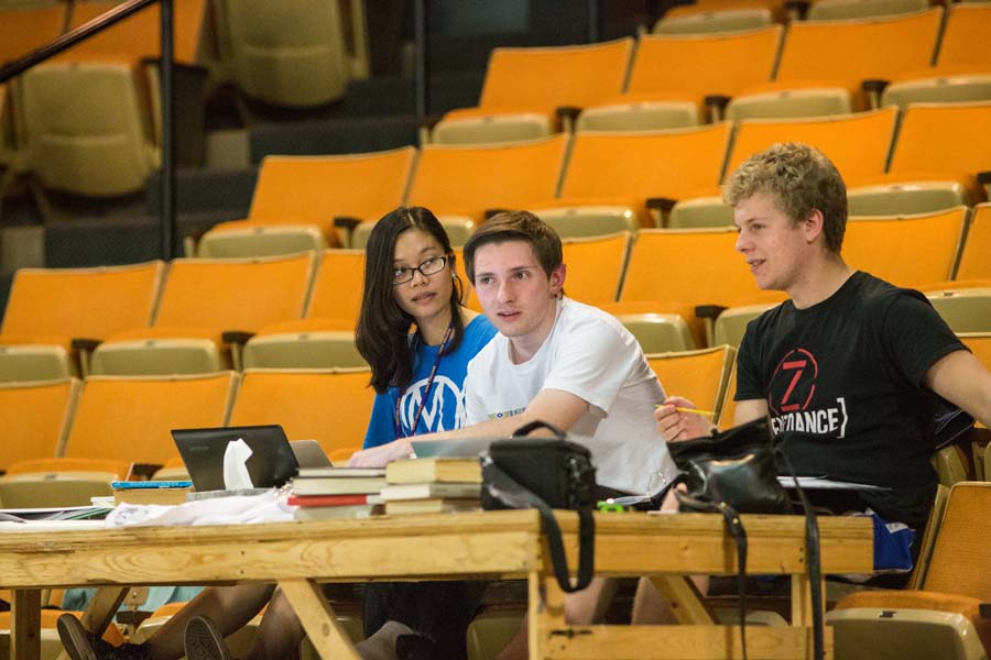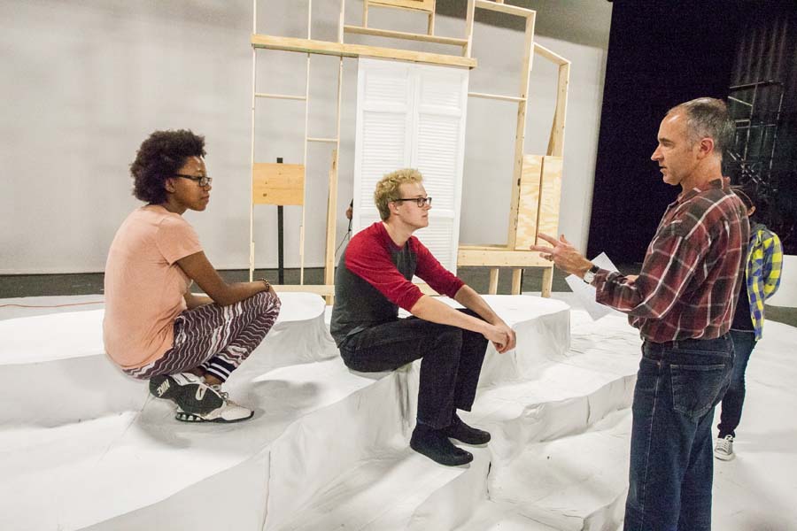 Photos above: students Lee Foxall and Van Johnson as master and servant, respectively, rehearsing "The Island of Slaves"; below cast and crew working with director Neil Blackadder.