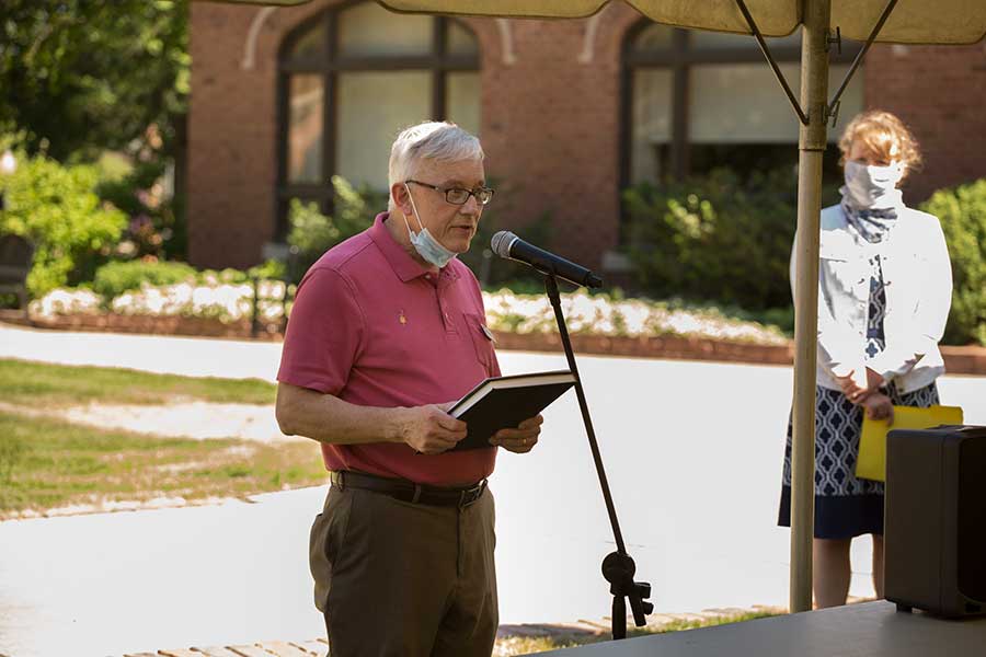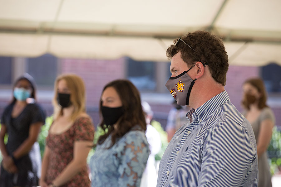 On Friday, June 4, students gathered in a tent set up between the library, Alumni Hall, and Seymour Union for a short ceremony. A welcome address was given by Assistant Professor of Political Science & International Relations Katie Stewart, followed by a presentation on the history of the organization by Rothwell Stephens Distinguished Professor and Chair of Mathematics and Chair of Data Science Kevin Hastings ’76. Inductees were called up to pledge before signing the roster book and receiving their certificate. Then, after the ceremony’s conclusion, they ate ice cream together and socialized outside.