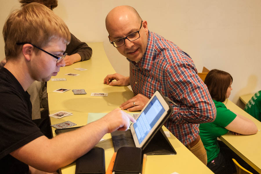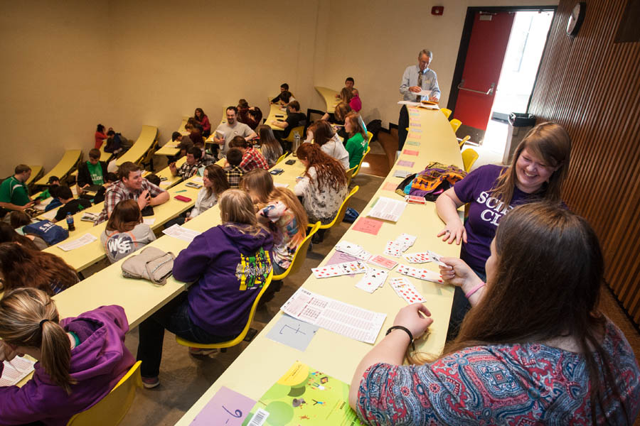 Above, the four trophy-winning teams from the 2015 Knox College Sectional WYSE Academic Challenge: ROWVA, Monmouth-Roseville, Galesburg and United Township high schools; students from Brown County High School play cards while waiting for testing to begin; Farmington HIgh School WYSE coach Rich Paul talking to one of the students on his team; top of page, a Knox College student administers the test in one of several exam rooms.