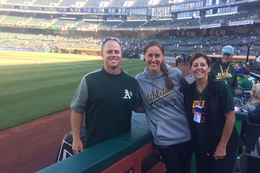 Photo above: Zach interned on the grounds crew for the Burlington Bees while a student at Knox. Photo below: Zach with his sister, Kelly Ricketts '12, and their mom at Oakland Coliseum.